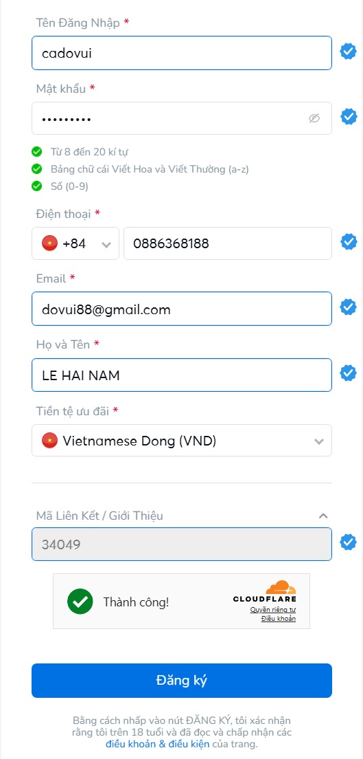 - bấm xác nhận nút cloudflare như hình ảnh dưới là được.Sau đó kích nút Đăng ký màu xanh là được.